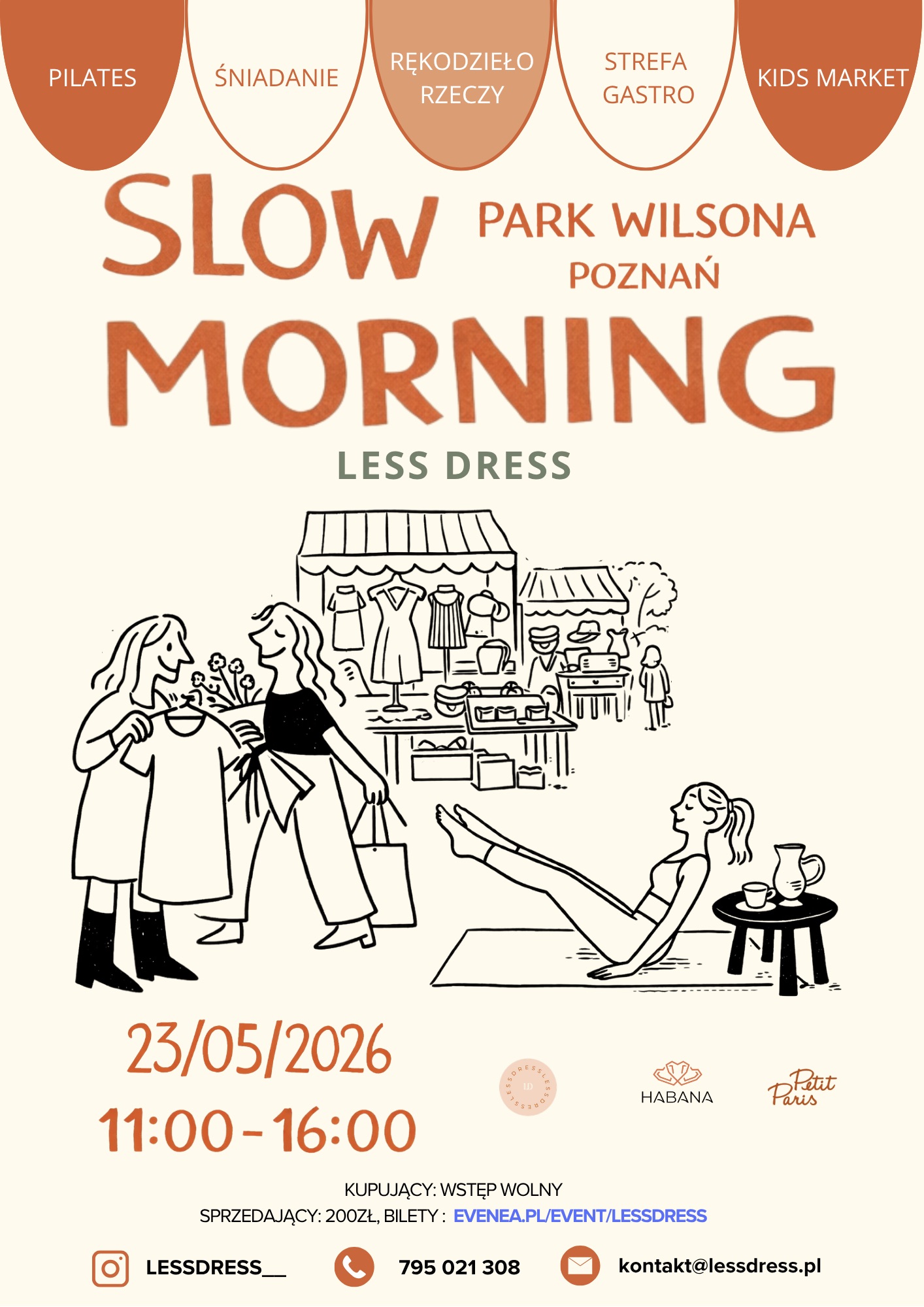 | 23 maja 2026r. | Slow Morning w Parku wietrzenie szaf pilates strefa gastro lokalne rękodzieło i twórcy atrakcje dla dzieci ![]() | concept store Less Dress lessdress.pl |